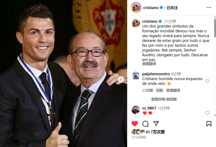 不过,近日葡萄牙体育功勋青训教练兼球探奥雷利奥-佩雷拉去世,享年77岁,C罗亲自在社媒发文致哀。